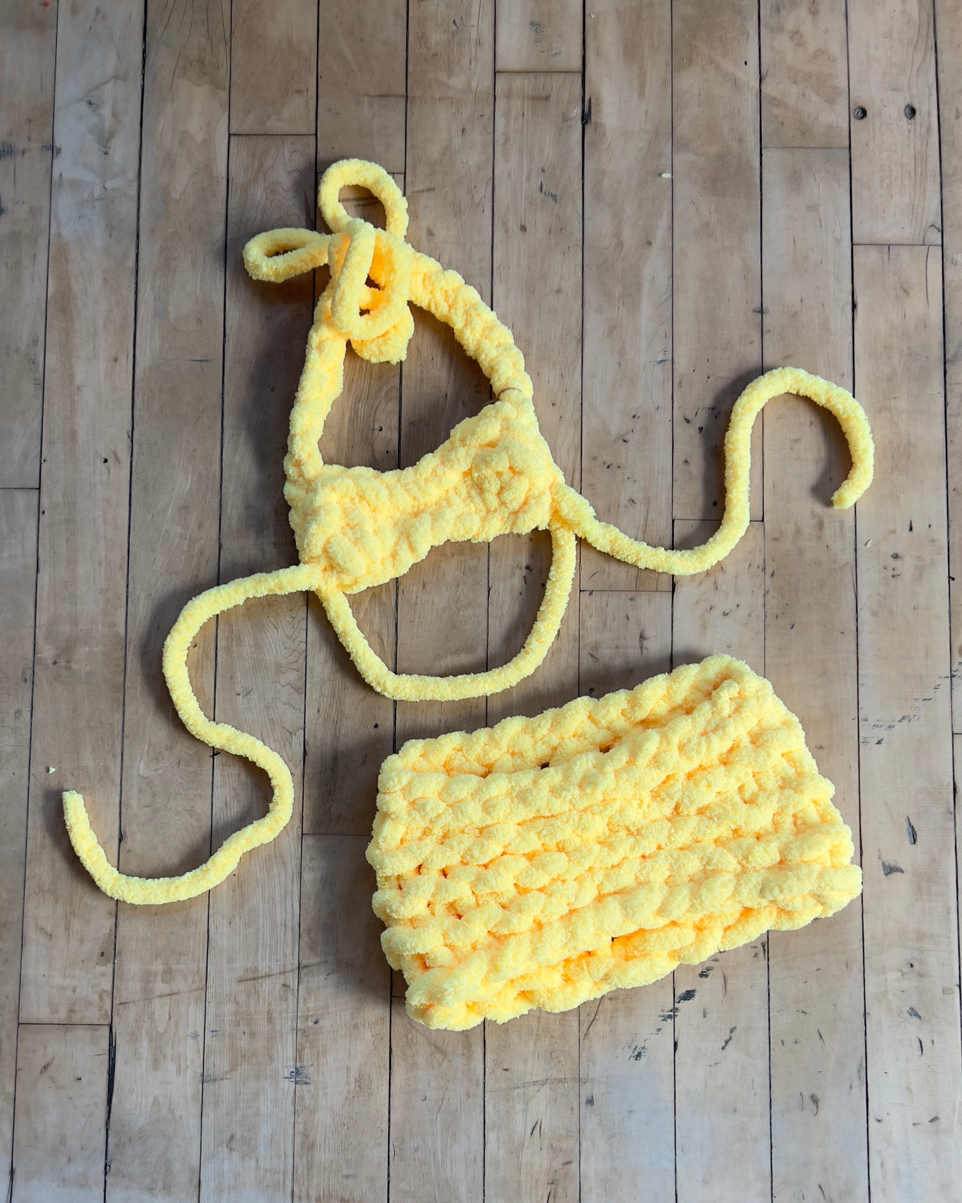 Hand-knitted chunky chenille wool as an adjustable halter-neck crop top and super-micro mini skirt with open back detail.